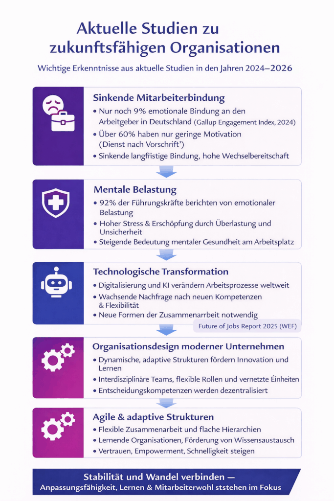 Insgesamt zeigen aktuelle Studien übereinstimmend, dass Zukunftsfähigkeit nicht primär durch technologische Innovation oder strukturelle Effizienz entsteht, sondern durch eine Kombination aus organisationaler Anpassungsfähigkeit, lernorientierter Kultur, Mitarbeiterorientierung und flexiblen Strukturen. Organisationen stehen damit vor der Herausforderung, Stabilität und Wandel gleichzeitig zu gestalten und ihre Strukturen kontinuierlich an eine komplexe und dynamische Umwelt anzupassen.