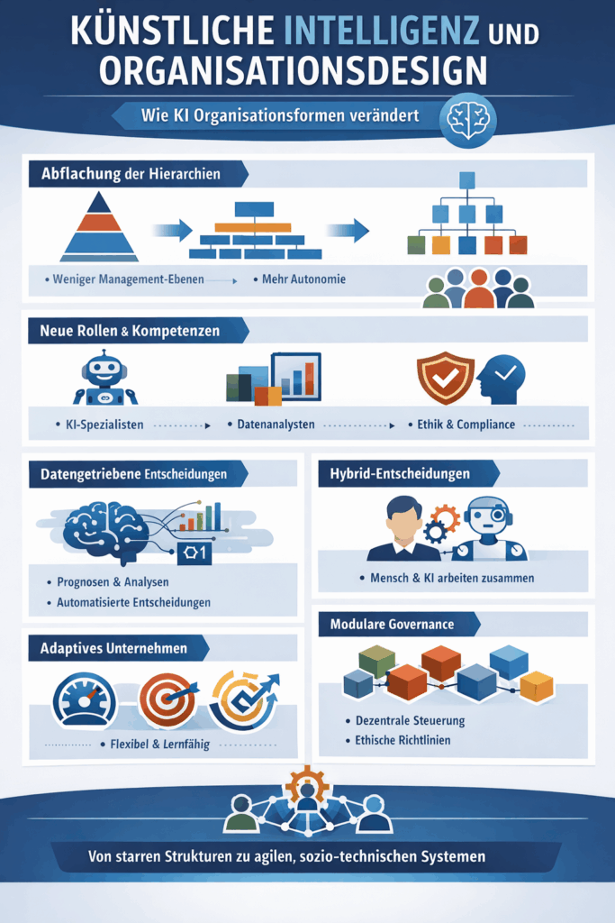 Aus der Perspektive der Organisationsstrukturen nach Henry Mintzberg (1979) deutet die Integration künstlicher Intelligenz auf eine Verschiebung traditioneller Strukturformen hin. Während klassische Industrieorganisationen häufig durch mechanistische Bürokratien mit standardisierten Prozessen und klaren Hierarchien gekennzeichnet sind, begünstigt KI stärker adhocratische und innovative Organisationsformen. BMW Group oder Robert Bosch GmbH zeigen etwa eine zunehmende Bedeutung funktionsübergreifender Teams und projektbasierter Arbeitsstrukturen, die charakteristisch für adhocratische Organisationsmodelle sind. Gleichzeitig verändert KI die Rolle der sogenannten Technostruktur, da algorithmische Systeme selbst Standardisierungs- und Koordinationsfunktionen übernehmen, die traditionell von Management oder administrativen Einheiten ausgeführt wurden.